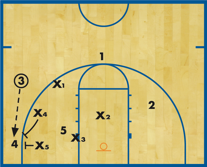 DIAGRAM 4: 3 passes to 4, who had cut to the ball-side corner. X5 and X4 close out on 4 to set a trap in the corner. X3 plays 5 in the post, and X2 cheats down in the lane to help X5 if the pass is made inside. X1 plays the passing lanes to 3 and 1, giving a 2-2-1 look.