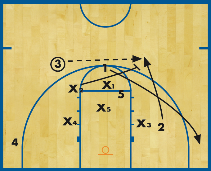 DIAGRAM 3: 1 passes to 3 above the foul-line extended. The defense reacts accordingly, giving a 1-2-1-1 look while continuing to deny any passes away from the sideline.